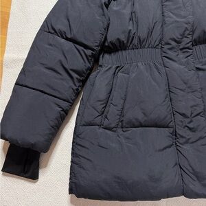 Primaloft Puffer Midi Coat Black Fur Trim Hooded Winter Jacket from Gap.