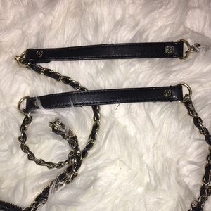 DKNY Black Quilted Small Shoulder Bag | Gold Chain Straps w/ Black Leather Inner Twined Run Through Bag via 2 Gold Riveted Holes on Each Side of Purse to 6.5” Thin Leather Straps for Shoulder Comfort | Exterior Gold Zip Top and Around Approximately 2” w/ Gold Signature Pull | Front Gold Signature Faux Buckle | Base Length 10” | Width 2.5” | Side Height 6.5” | Interior Perfect Condition Signature Fabric | 1 Side Cinched Slip Pocket | 1 Side Leather Framed Zip Closure Pocket w/ Tassled Pull | Gold Signature Plate Below Zipper