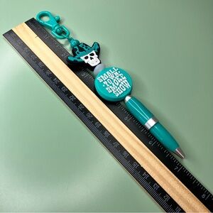 Teal handmade beaded keychain pen with a plastic clasp at the top. Perfect for attaching to your purse, backpack, lanyard, or keys, so you always have your pen when you need it! All of the beads are made of silicone. The top one is a skull wearing a cowboy hat and the bottom says Small Town Smoke Show in a western style font. It is a new without tags handmade beaded pen, however small imperfections may be present. Please see photos for details and approximate measurements. Ink color is black. Ask me any questions!
