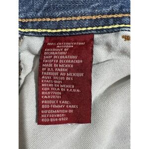 The product is a pair of Tommy Hilfiger Men's Jeans in a blue cotton material, size 31x32 with a red label carpenter fit. These Y2K baggy style jeans feature a mid-rise and straight leg, along with cargo pockets for added functionality. The jeans are designed for men and made by the well-known brand Tommy Hilfiger, ensuring quality and style.