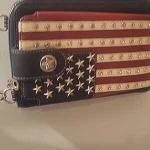 Chic wallet featuring an American flag design with a strap. Ideal for a patriotic flair. I only carried this purse a few times. It's an eye catcher with the beautiful red white and blue. It comes from a smoke-free home and no pets.