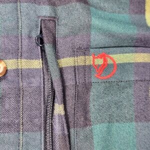 Classic blue and green plaid pattern with yellow stripes. Features a chest pocket with red Fjallraven fox logo embroidery and vertical zippered pocket. Swedish flag tag at hem. Button-down collar and sleeves can be rolled and secured with button tab.