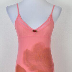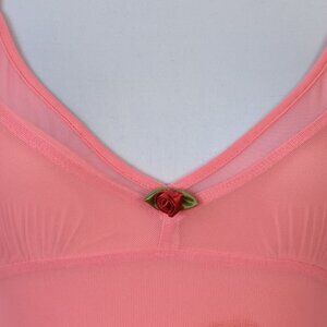 Adjustable spaghetti straps. V-neck with mesh trim. Mesh overlay. Fully lined. Stretch material. Rose print on front.