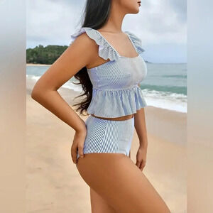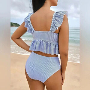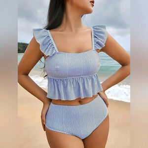 #bikini #highwaistedbikini #twopieceswimsuit #rufflebikini #pinstripeswim #beachwear #vacationstyle #summerstyle #poolsidefashion #resortwear #nwt #coastallook #classicbikini #womensswimwear