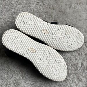 Comfortable and stylish. Black full-grain leather and black metallic leather on vamp strap Back zipper Adjustable hook and loop closure Leather lining Contoured footbed with synthetic lining Arch support Lightweight TPR outsole