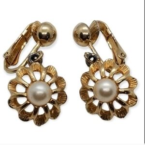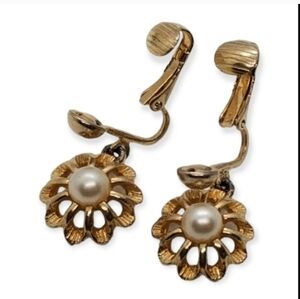 Beautiful vintage Avon earrings with dangle design feature goldtoned brass flowers with faux pearl centers. Earrings measure 1 inch long and 3/4 inch wide. Earrings are clip-on style and are marked Avon on back.