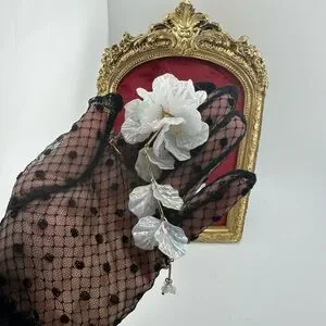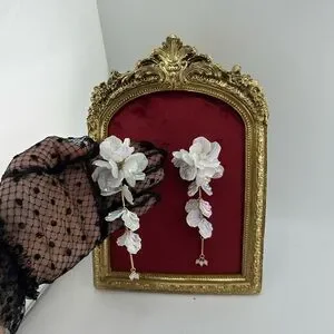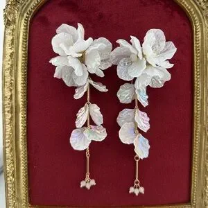 Stunning white floral drop earrings with iridescent petals. Perfect for special occasions.