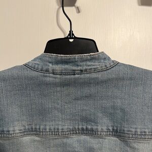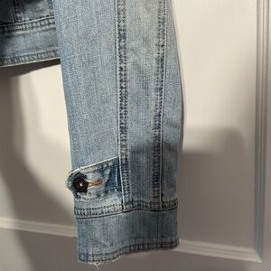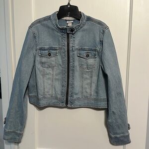 Venezia cropped light denim jacket. With 2 front functional pockets and zipper closure. Size is 14/16 with slight stretch. 1 button closure at neck. Perfect for spring and summer. Please view all photos as they are apart of the description. From a smoke and pet free home.