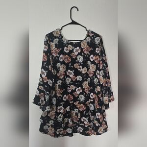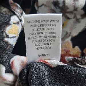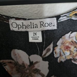 Beautiful Ophelia Roe floral blouse in women’s size 2X. Features a black base with an allover floral print, button-front detail, and a flowy peplum silhouette for a flattering fit. Lightweight and comfortable. Perfect for casual wear, work, or layering.