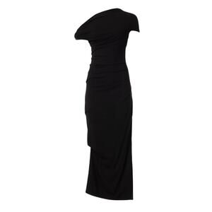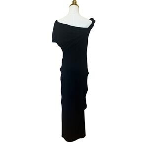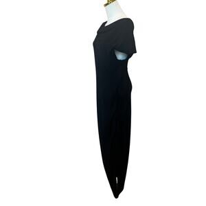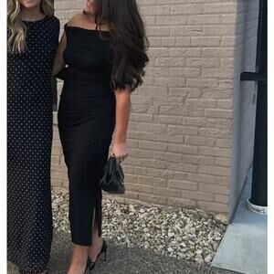 Paris Georgia Black Ruched Midi Dress MEDIUM Bodycon Off Shoulder Cocktail $250