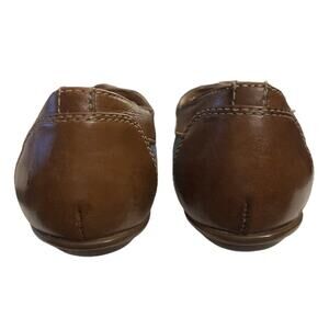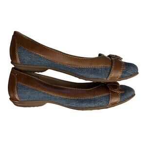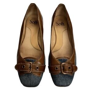Sofft Womens Flats Brown Leather Denim Blue Trim Shoe with Brown Leather Buckle on Toes Brass Buckle 7.5 M Slip On Ballet