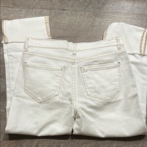 Kensie Vintage Luxe The Slim White Cream cropped Jeans with raw hem size 2/26. Raw hem/cuff can be rolled or worn unfolded. Cream White with contrasting gold thread detail. Gently pre-loved condition. 98% cotton/2% spandex.