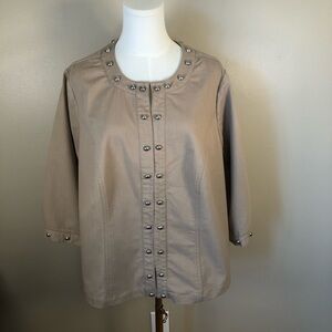 Features ribbed neck, cuffs, & hem with rolled trimming