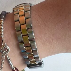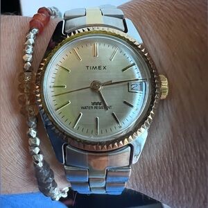Timex watch with a two-tone design. Features a date display. Water resistant.