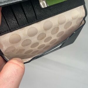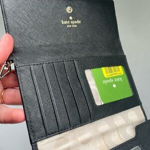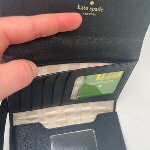 Gently used Kate Spade New York Cedar Street tri-fold wallet wristlet in high-quality leather. This versatile piece features a phone case slot, multiple card and cash compartments, and a sleek design perfect for everyday use. Exterior leather is in great condition, while the interior shows minor makeup staining around the phone case area (see photos).