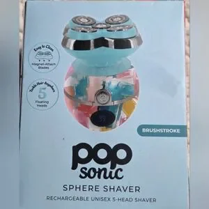 This is a new in box pop sonic brushstroke colour sphere rechargeable 5 head shaver with easy clean magnetic blades and ergonomic handle and easy to read LED battery level display.