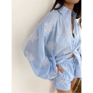 Keywords: shirt and shorts set, two piece set, blue embroidered set, bohemian style, loungewear set, summer outfit, beach cover up, resort wear, vacation outfit, button down shirt.Bins 024-55