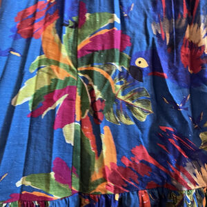 Bring vacation vibes to your wardrobe with this stunning House of Harlow 1960 tropical midi dress. Featuring a vibrant parrot and floral print on a rich cobalt blue background, this boho-inspired dress is effortless, breathable, and perfect for resort, summer, or beach styling.
