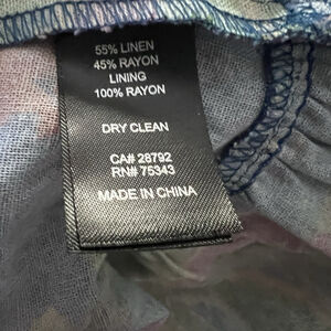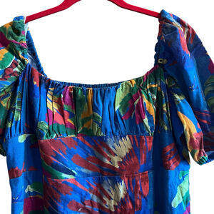 House of Harlow 1960 Large Tropical Parrot Linen Midi Dress Puff Sleeve Blue