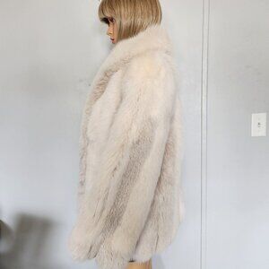 Pollack Furs white with blush stripes fox fur coat, hook and eye closures, 2 pockets, monogrammed, size approximately small by measurements. A very beautiful coat! Measurements are arm pit to pit 20", shoulders 18", sleeves 23" and length 28".