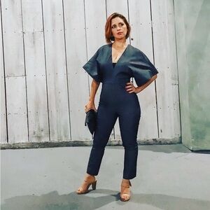 Chic and rare Cushnie et Ochs denim-inspired kimono jumpsuit in deep indigo. Features a plunging V-neckline, dramatic kimono sleeves, belted waist detail, tapered leg and exposed back zipper. Sleek, flattering, and unapologetically modern — signature Cushnie tailoring.