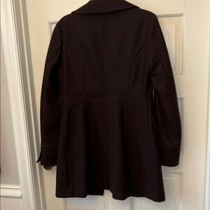 Adorable coat with girlie detail such as Peter Pan collar, cinched in waist, whimsical print lining, and oversized dyed to match buttons. Excellent preowned condition. See pics for specifics.