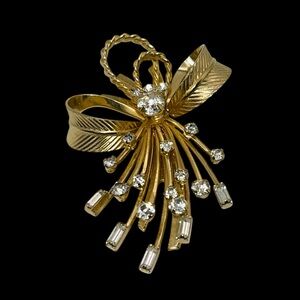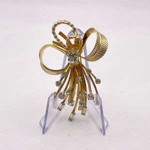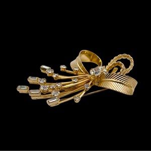 For your consideration is a signed Sarah Coventry rhinestone spray brooch. It features a textured gold tone bow with gold tone sprays. The brooch has round and baguette rhinestone accents for dazzle. A beautiful piece to dress up any outfit.
