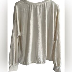 Chic cream sweatshirt with drawstring hem. Soft fabric. Ideal for casual wear. Length is 24” Pit to Pit is 25”