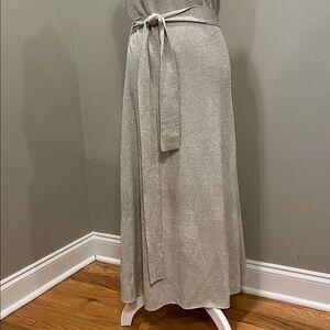 Chic cream maxi dress with a flattering V-neck. Includes a matching belt for a tailored look. Ideal for elegant occasions.