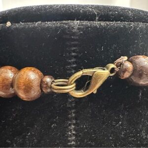 - Yellow mustard, blue and brown acrylic beads. It also has brown wood beads.