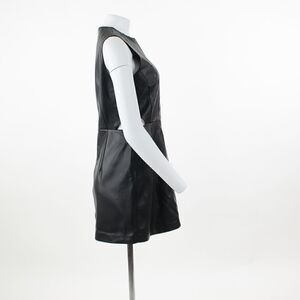 Side cutouts add geometric style to a faux leather dress with a retro silhouette. Crew neck Sleeveless Back zip closure Cutout details.