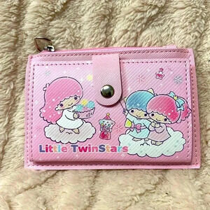 This is a new Hello Kitty TwinStars wallet. It is a pretty pastel pink. It snaps in the front. Inside has several places for your credit cards and has a space to put your bllls. It also has a zipper compartment for coins. The zipper had a dangling darling little heart in it, it is one adorable little wallet. Thank you for looking 👀