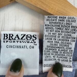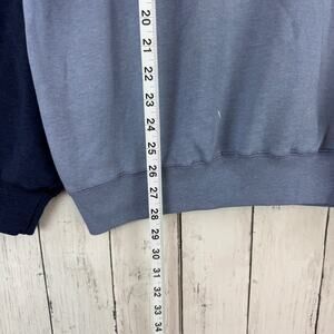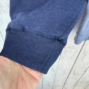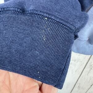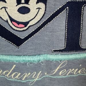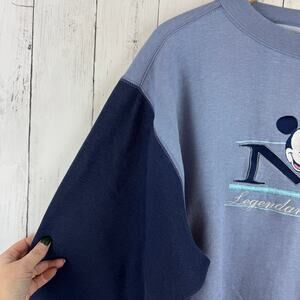 Details: Polyester/cotton, two-tone blue fleece, embroidered Mickey on front with "Legendary Series," crew neck, pullover, ribbed cuffs and waist, machine wash.