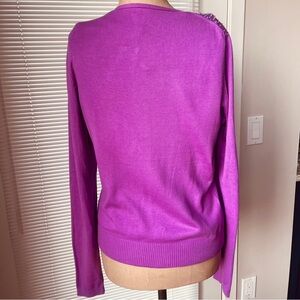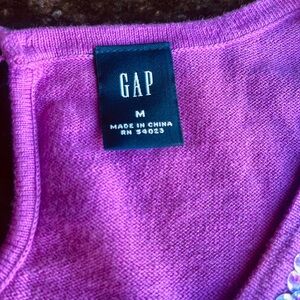 Gap fuschia cardigan and matching shell sweater set with shimmering details. This beautiful sweater is perfect for spring or all year. Cardigan has hook and eye closures. Both sweaters have clear pearlescent sequins around tte front necklines. Shell has rear keyhole opening with decorative clear button closure.