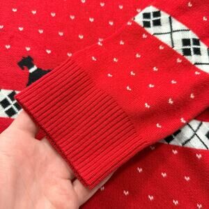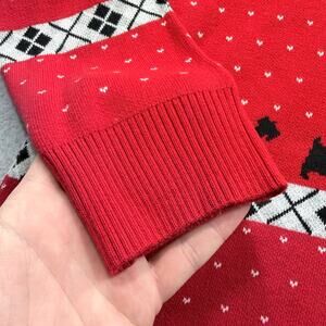 This charming Charter Club women's sweater features a vibrant red base adorned with playful black dog silhouettes and classic argyle-style patterns in black and white. Crafted for comfort and warmth, the sweater has a cozy knit texture with ribbed cuffs, hem, and crew neckline that ensure a snug fit and add to its timeless style. The pattern of small white dots scattered throughout enhances the festive and unique look, making it perfect for casual gatherings or everyday wear.