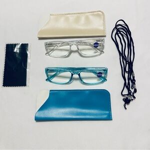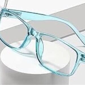 NEW. Never used. Trendy eyeglasses with a sleek design. Features a blue frame and a clear frame. Perfect for a modern look.