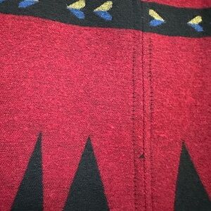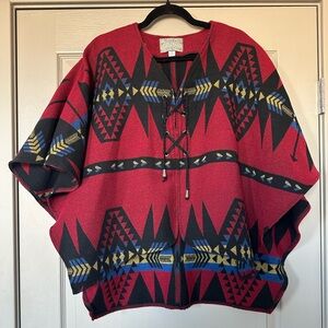 Bold, collectible and classic Southwest style this vintage Silverado poncho top features a striking geometric Navajo-inspired pattern in red, black, blue and gold. Lacetime front neckline, wide poncho sleeves, and an easy open-drape silhouette make it perfect for Western styling, rodeo looks, Santa Fe vibes, or festival outfits. Made in the USA.