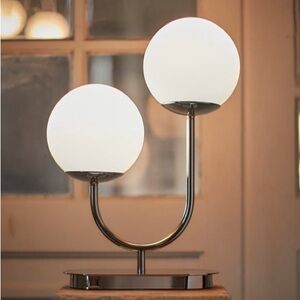 Stylish table lamp with dual white globes. Adds elegance to any room.