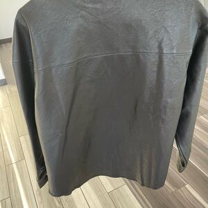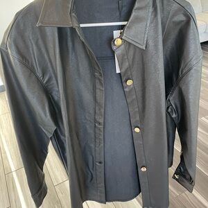 Elevate your style with this sleek black button down leather shirt. Perfect for any occasion, it offers a sophisticated look with its classic design and gold button accents.