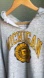 Heather gray sweater with yellow and navy blue varsity lettering and crest logo.