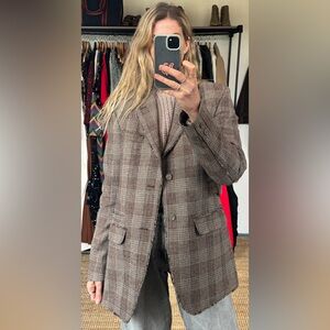 Vintage Oversized Brown Plaid Wool Blend Raw Hem Blazer Jacket