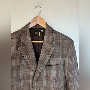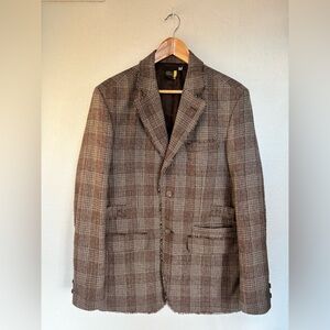 Vintage Oversized Brown Plaid Checkered Wool Blend Raw Hem Blazer Jacket