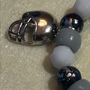 Show your love for the game with this stylish football-themed beaded bracelet. Featuring a mix of brown, white, and silver beads, it's perfect for any sports enthusiast.