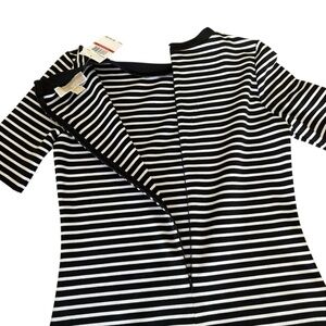This Michael Kors dress features a striking black and white stripe pattern, perfect for casual or work settings. The sheath style offers a flattering fit with a crew neck and short sleeves. Its mini length and streamlined silhouette make it a versatile addition to any wardrobe.