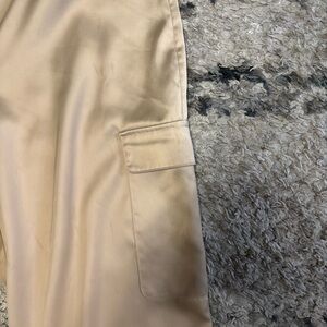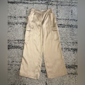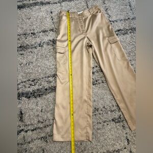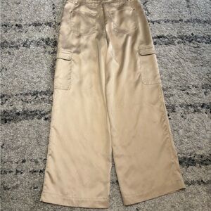 Luxurious satin wide leg pants by Cache. Elegant cream color with cargo pockets. Perfect for stylish occasions. Model has a similar tyle fit for a idea !