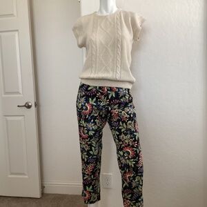 Appleseed’s 8p have 3% spandex, which allows for significant stretch. They are a colorful floral with vines on a black background. They are perfect for spring and summer. The multicolored flowers and vines make these pants versatile. They have a front button at the waist and a zipper closure. They also have two front pockets and are a straight leg. For those who aren’t petite, these can still be worn as cropped pants. I’ve included extra photos to inspire outfit ideas. All items are in my closet. These are gently used with no tears or irregularities.