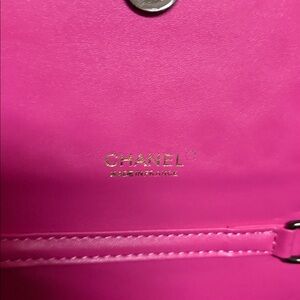Chic fuchsia quilted leather clutch. Features elegant chain detail. Perfect for stylish outings.