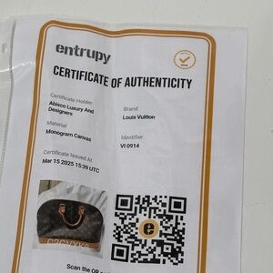 Stylish satchel with iconic monogram pattern. Features sturdy handles and elegant design. Excellent condition both inside and out small stain on inside that can be probably wiped out. I haven’t tried to get it out. Comes with an entropy COA.