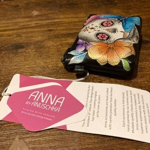 Anna by Anushka leather hand painted coin purse. It is black with a skull, butterfly and flowers painted on front. It is 4 1/2" x 3" x 3/4".
