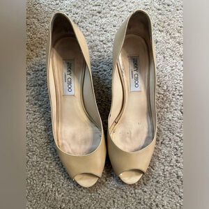 Condition: Minor wear on shoes. Bottoms show signs of wear, and heels have minor peeling of the leather. See pictures. #JimmyChoo #PeepToePumps #DesignerShoes #NudePumps #PatentLeather
